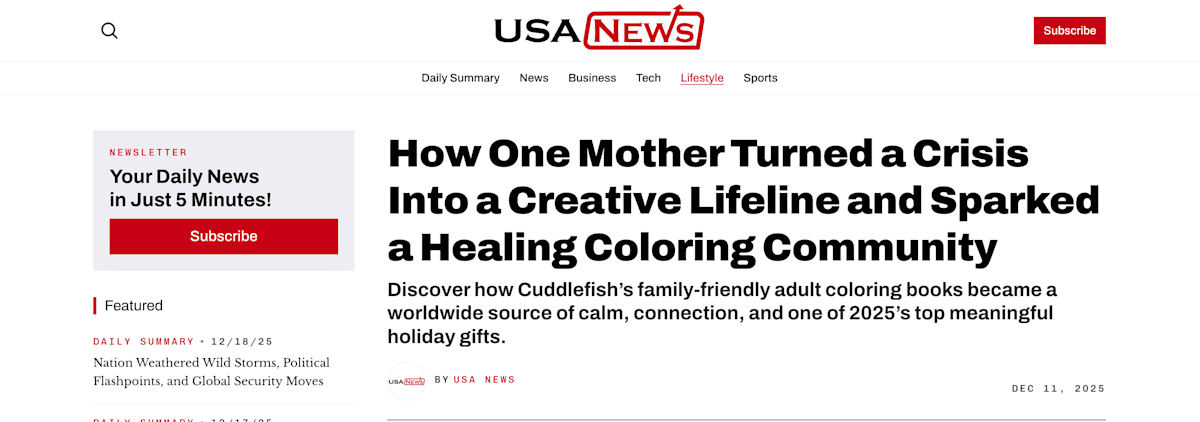 The article shares our story and explores how coloring has become a source of calm, creativity, and connection for families, caregivers, and anyone who needs a gentle pause in their day. I’m deeply thankful to everyone who has colored, shared, and supported this journey, and to USA News for helping tell it.